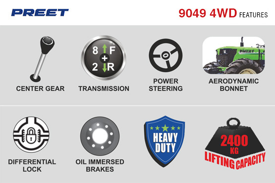 PREET 9049 - 4WD 90 HP Tractor (CANOPY) comes with plenty of features to assist you in the daily farming works. Equipped with advanced features PREET 9049 is capable of almost every agricultural application. Some of the features are stated as under: