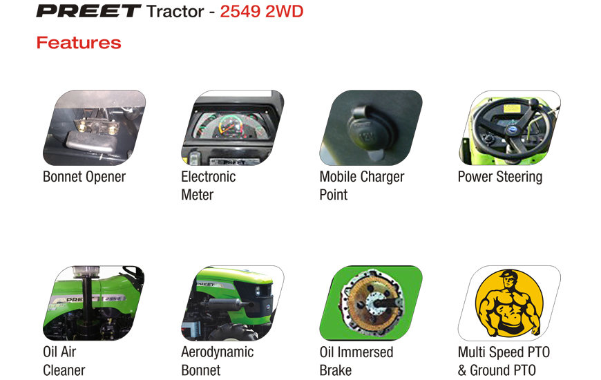 PREET 2549 - 25 HP 2 Wheel Drive Tractor comes with plenty of features to assist you in the daily farming works. Equipped with advanced features PREET 2549 is capable of almost every agricultural application. Some of the features are stated as under: