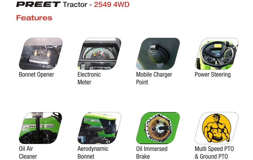 PREET 2549 - 25 HP 4 Wheel Drive Tractor comes with plenty of features to assist you in the daily farming works. Equipped with advanced features PREET 2549 is capable of almost every agricultural application. Some of the features are stated as under: