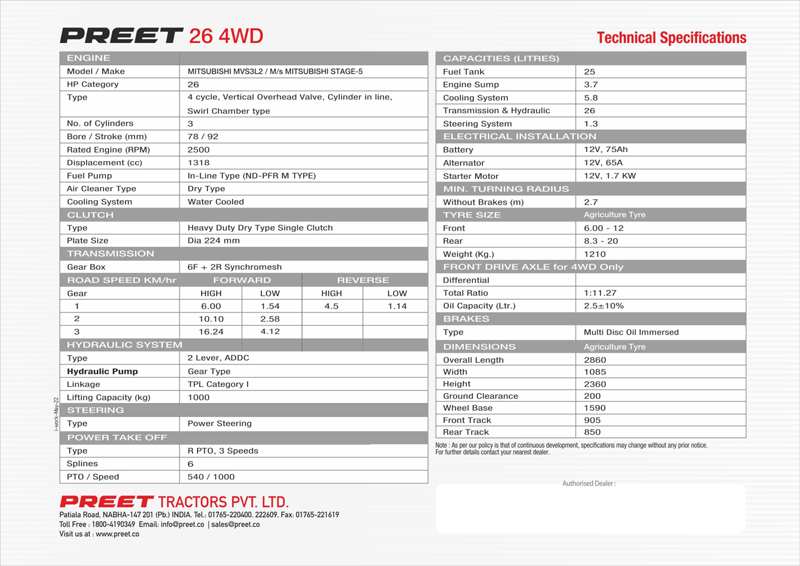 PREET Group will be pleased to provide specific technical data or specifications with respect to any particular PREET Agricultural Tractor model.