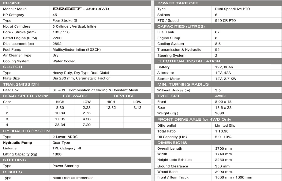 PREET 4549 - 45 HP 4 Wheel Drive Tractor comes with plenty of features to assist you in the daily farming works. Equipped with advanced features PREET 4549 is capable of almost every agricultural application. Some of the features are stated as under:
