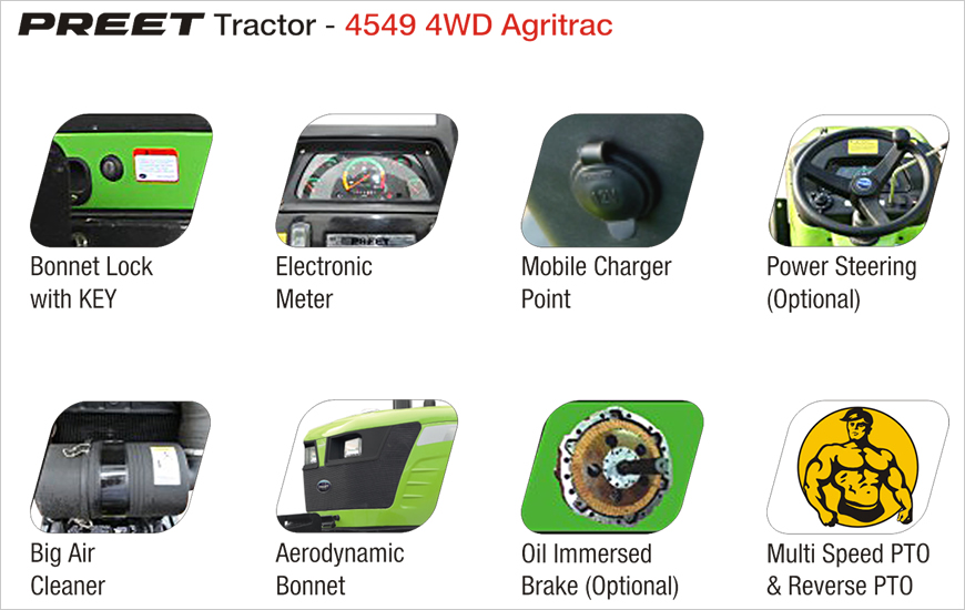 PREET 4549 CR - 45 HP 4 Wheel Drive Tractor comes with plenty of features to assist you in the daily farming works. Equipped with advanced features PREET 4549 CR is capable of almost every agricultural application. Some of the features are stated as under: