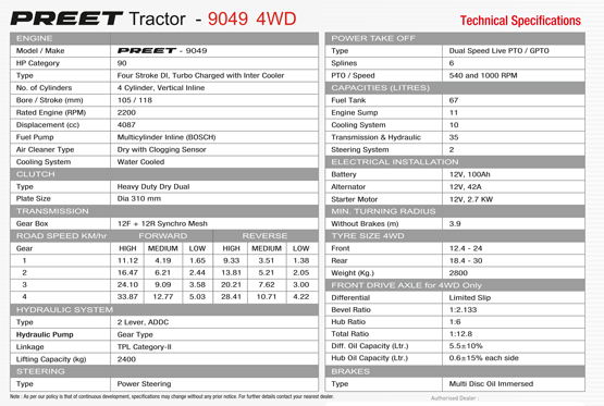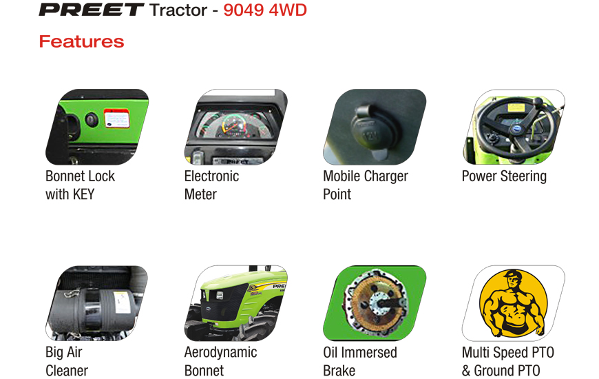 PREET 9049 - 90 HP 4 Wheel Drive Tractor comes with plenty of features to assist you in the daily farming works. Equipped with advanced features PREET 9049 is capable of almost every agricultural application. Some of the features are stated as under: