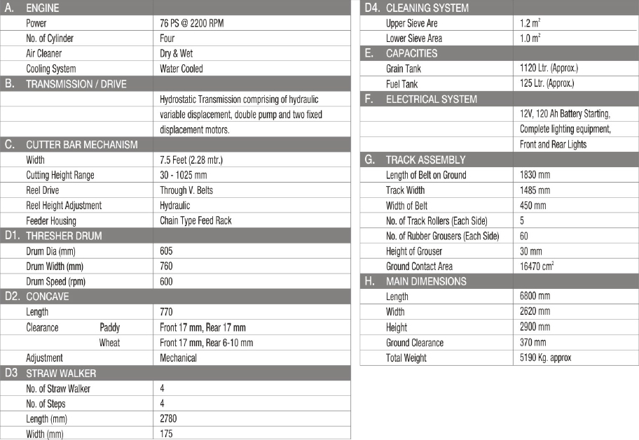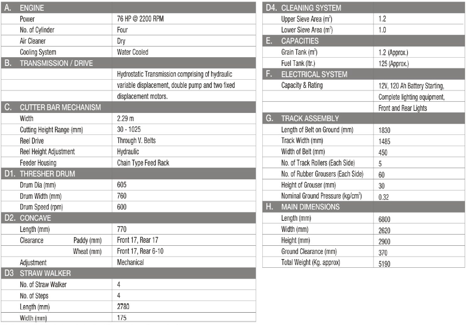 PREET 949T Singham - Track Combine Harvester features a high-power Four Cylinder Diesel Engine. A large Torque Reserve, Simple Design, Low Maintenance Costs are coupled with High Fuel Efficiency and Friendly to the Environment. Clean grain is stored in a large-capacity grain tank. Such capacity increases performance efficiency by reducing unload cycles. Improved Augar System for Quick Unloading of grains into trucks and trailers.
