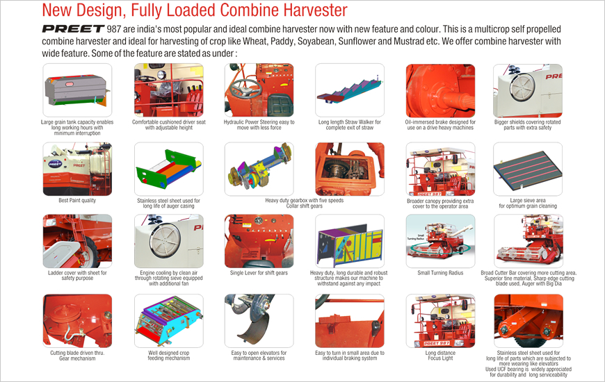 The facelifted PREET 987 is the genuine king of crop harvesters. It represents the best performance, productivity and serviceability available at the moment. PREET 987 is India's most Popular and ideal combine harvester now with new features and color. This Multicrop Combine Harvester is designed for harvesting all traditional grain crops like Wheat, Paddy, Soyabean, Sunflower and Mustrad etc. Some of the features are stated as under: